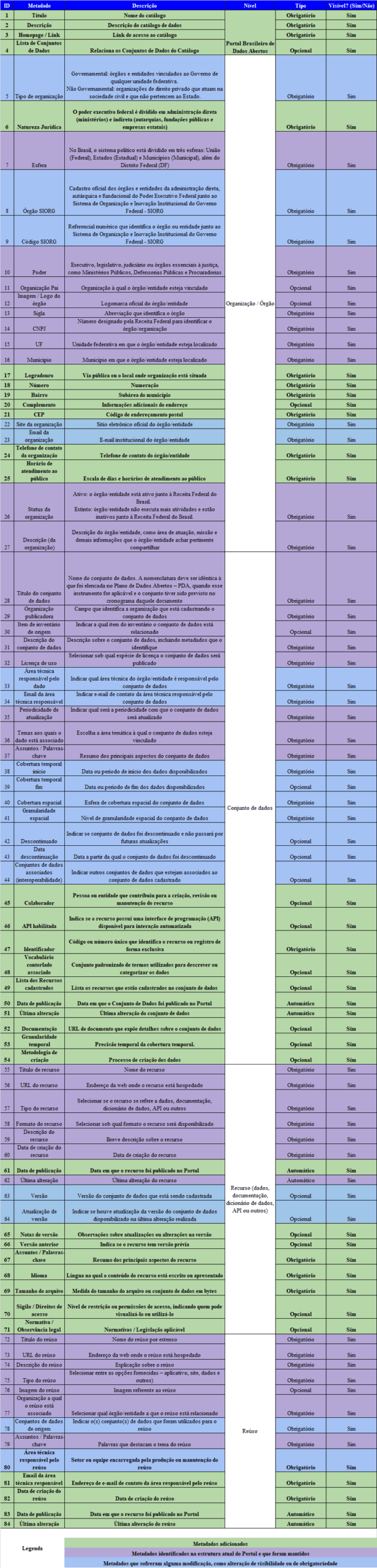 - Conjunto de dados: abrange uma coleção de dados que são publicados ou mantidos por uma organização e estão disponíveis para acesso ou download em um ou mais formatos são propostos são 27 metadados, sendo 17 da estrutura atual do Portal, 10 acréscimos e duas exclusões.